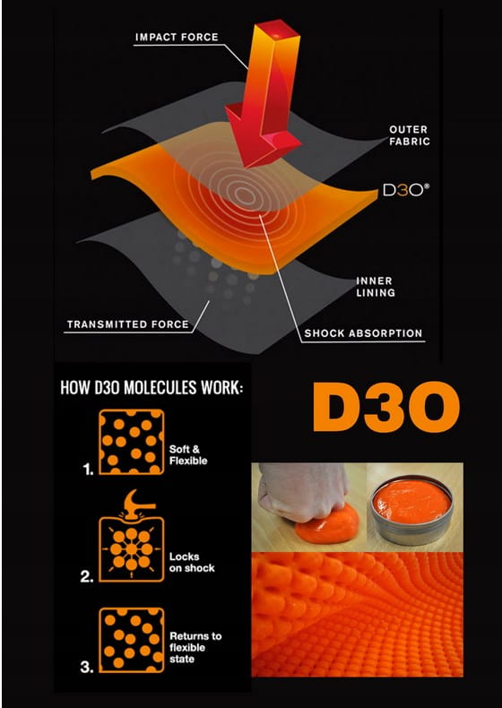 | Materiały | Poliester, nylon, poliuretan, POM, kauczuk, D3O® |